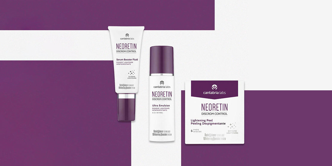 Powerful LIGHTENING Neoretin® Discrom Control is a powerful lightening regimen of photodamaged skin & skin with dark spots or hyperpigmentation that combines RetinSphere® Technology with Whitening Booster System, a system of powerful actives (including Kojic acid, lightening peptides and Niacinamide) which intervene in all phases of melanin production and synthesis, thus ensuring optimal pigment control. Skin is clearer, brighter and with a more even complexion.